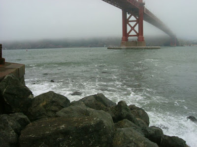 Após nova perseguição pelas ruas de San Francisco, o Jaguar verde dirige-se a Fort Point, junto à baia. Madeleine dá uns passos junto à amurada antes de se atirar à água neste local, sendo salva por Scottie. O local exacto da queda está em obras à superfície, pelo que vou poupar-vos à fotografia dos tapumes… Mas desci às rochas para fotografar melhor as águas, na secreta esperança de sentir o perfume da Kim Novak! E senti mesmo…